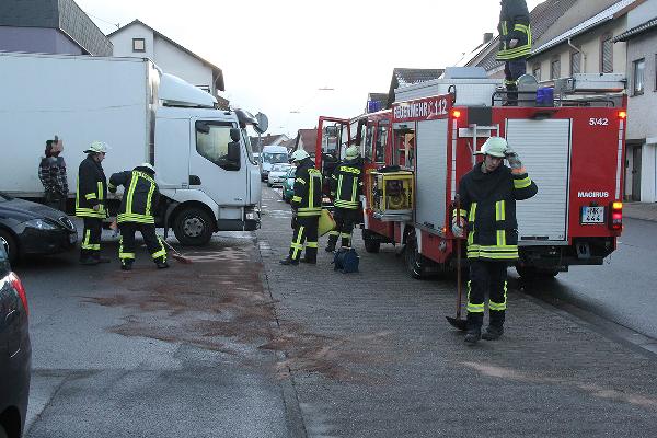 Zur Verhinderung einer erneuten Ausbreitung wurde der Bereich unter dem Lkw mit Bindemittel abgestreut. Der ebenfalls alarmierte Löschbezirk Hierscheid konnte die Anfahrt zu Einsatzstelle abbrechen.