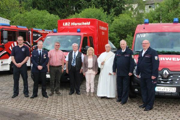 Bürgermeisterin Birgit Müller-Closset freute sich sehr, das neue Mannschaftstransportfahrzeug (MTF) an den Löschbezirk Eppelborn sowie das neue Mehrzweckfahrzeug (MZF) an den Löschbezirk Hierscheid zu übergeben. Doch auch an diesem feierlichen Anlass gab es für den Wehrführer Klaus Theis keine Ruhe, denn er musste noch vor Übergabe und Einsegnung in den Einsatz, sodass sich beides verzögerte. Das Unwetter kannte keine freien Tage. Neben Kreisbrandinspekteur Werner Thom, Wehrführer Klaus Theis und Landesbrandinspekteur a.D., Hans-Jürgen Ollinger waren zahlreiche Feuerwehrangehörige aus den Löschbezirken Eppelborn und Hierscheid sowie weitere Ehrengäste gekommen. Diakon Hugo Naumann segnete die beiden Fahrzeuge ein. Selbst strömender Regen konnte ihn von dieser wichtigen Aufgabe nicht abbringen. Der Fanfarenzug des Löschbezirks begleitete die Einweihung der neuen Feuerwehr-Fahrzeuge musikalisch.