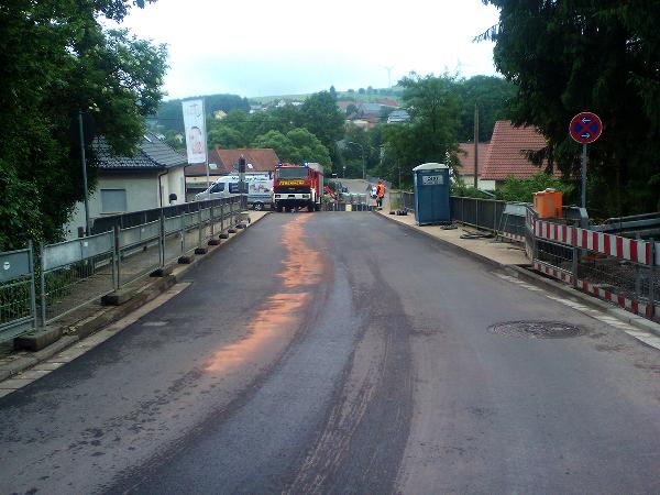 In der Calmesweiler Straße und am Brunnenplatz zog sich die Spur stellenweise massiv über eine Fahrbahnhälfte. Die Einsatzkräfte sicherten die Einsatzstelle zusammen mit der Polizei und streuten die Verschmutzung mit Bindemitteln ab.