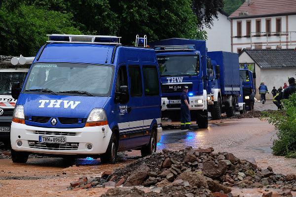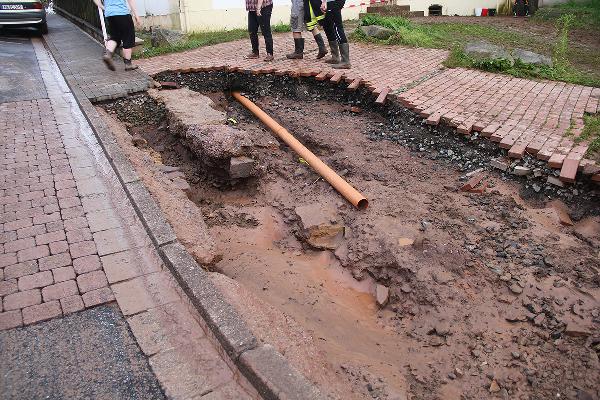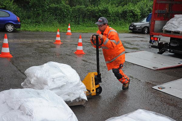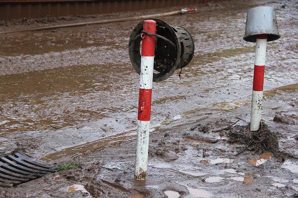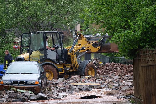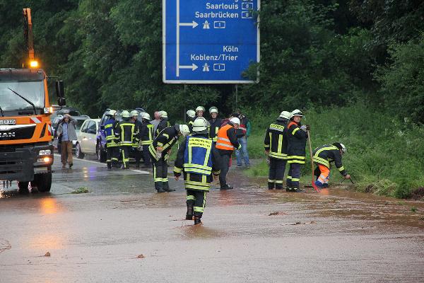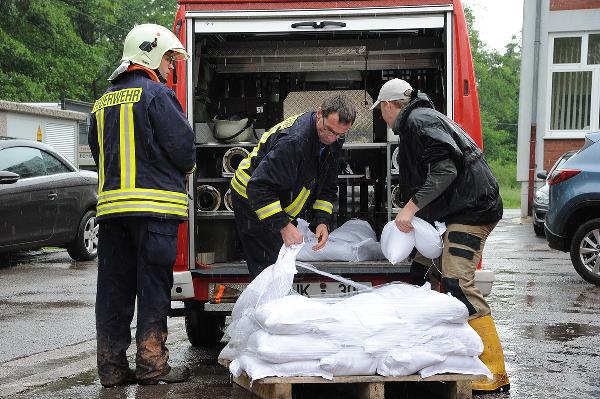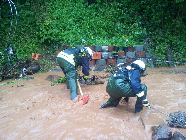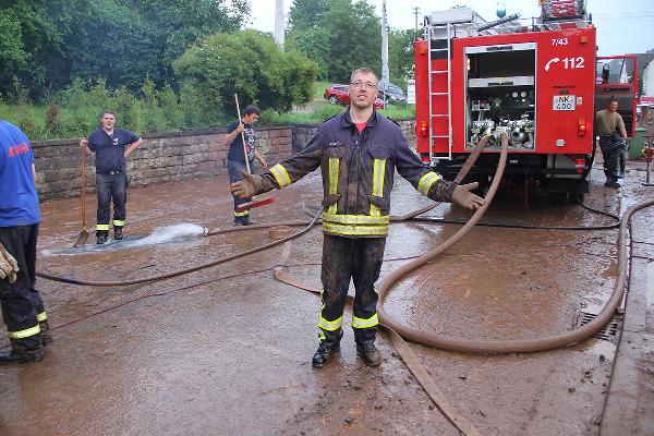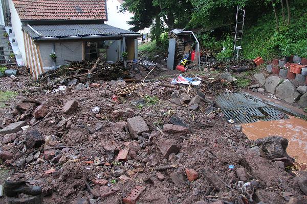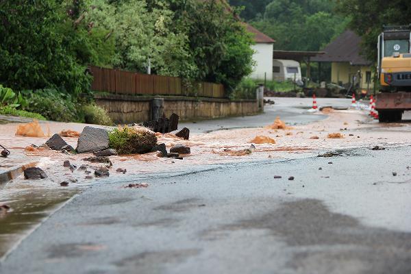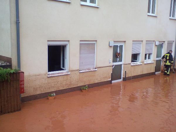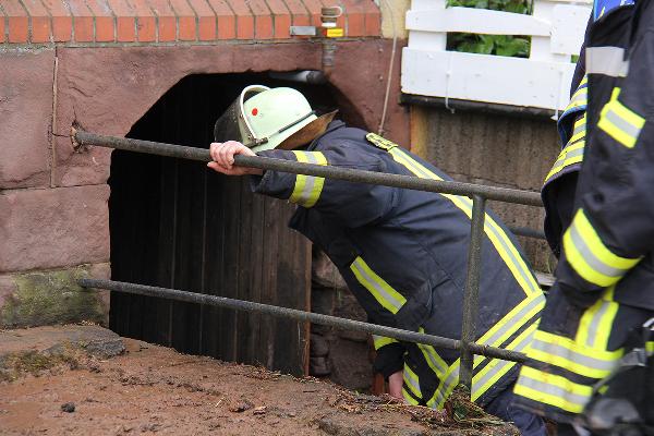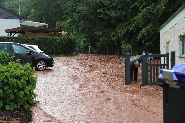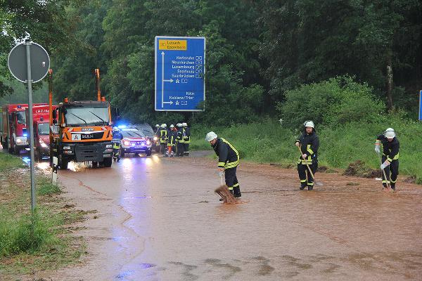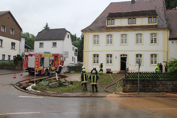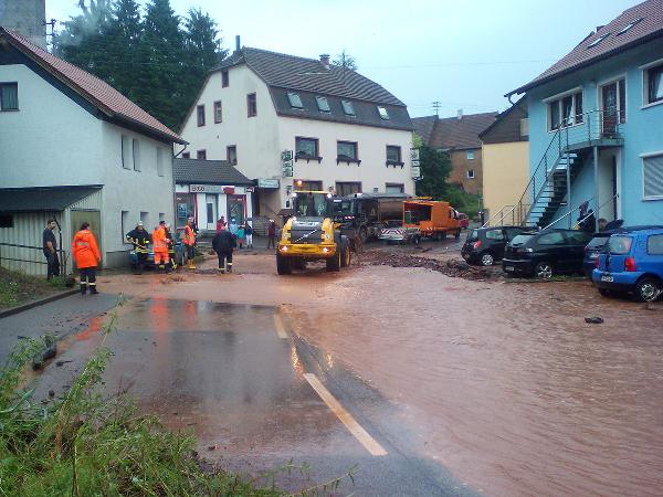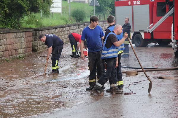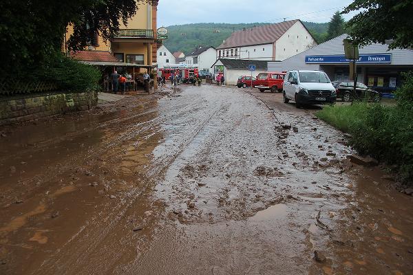 Dirmingen. Am Nachmittag des 07. Juni 2016 wurde der Eppelborner Ortsteil zum zweiten Mal innerhalb von nur vier Tagen von einem Unwetter heimgesucht. Gegen 15:45 Uhr zog eine Gewitterzelle über den Ort und brachte heftigen Starkregen mit. Innerhalb weniger Minuten ergossen sich wahre Sturzbäche von den Feldern und Wiesen über Straßen und Wege und überfluteten den gesamten Ort. Das Wasser spülte dabei große Mengen an Schlamm und Geröll mit, die die Regeneinlaufschächte verstopften und so die Situation noch verschärften. Nur wenig später wurde Alarm für alle acht Löschbezirke der Gemeinde Eppelborn ausgelöst.