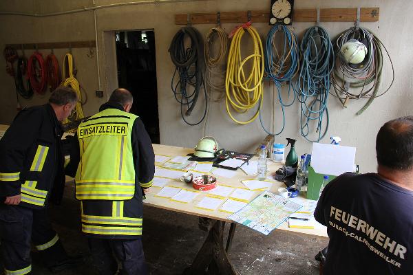 84 Einsätze mussten am Abend insgesamt abgearbeitet werden, eine große Herausforderung für die Einsatzkräfte unter der Leitung von Wehrführer Klaus Theis und seinem Stellvertreter Wolfgang Braun. Die Einsatzleitung wurde in den Räumen einer Dachdeckerfirma in der Ortsmitte von Dirmingen eingerichtet, unterstützt von den Einsatzleitwagen aus Ottweiler und des THW. Schadenslagen, die vom Kreislagezentrum kamen, wurden hier erfasst und an die Fahrzeuge weitergegeben.