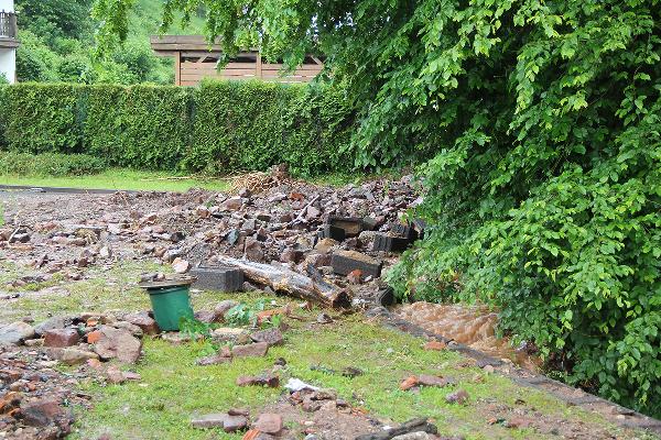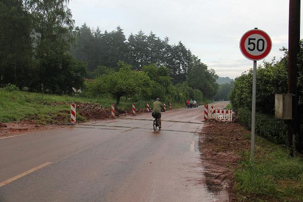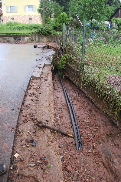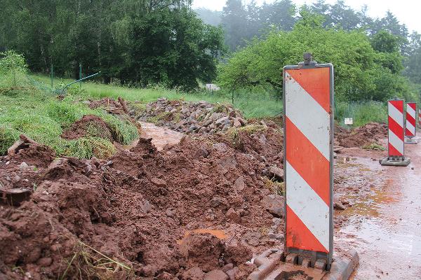 Aufgerissene Straßen, mitgerissene Wege, verwüstete Grundstücke, Gärten und in Mitleidenschaft gezogene Häuser: Auch am Tag nach der Katastrophe prägten die Folgen des Unwetters das Ortsbild von Dirmingen. Auch wenn sich das Wasser zurückgezogen hatte, gab es für die Helfer noch immer viel zu tun: Die Straßen mussten vom Schlamm befreit, Keller ausgepumpt und Schutt und Trümmer beseitigt werden. Die Ortsdurchfahrt Dirmingen blieb bis zum Nachmittag gesperrt. Da für den Nachmittag weitere Starkregenfälle gemeldet waren, wurden weitere Sandsäcke aus den umliegenden Gemeinden angefordert und an die Bürger ausgegeben.