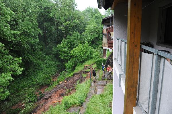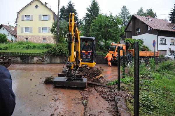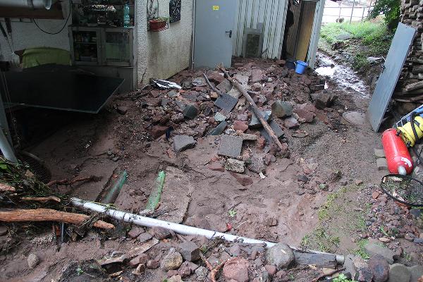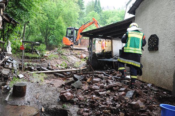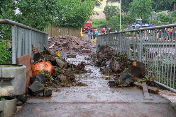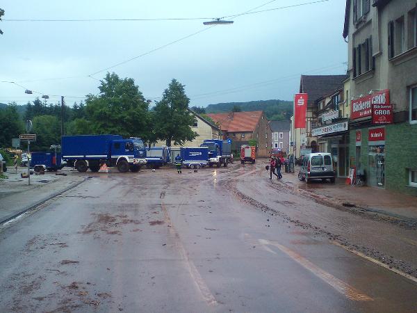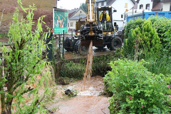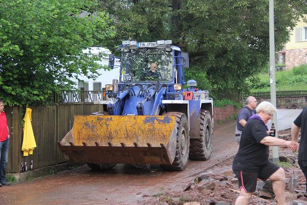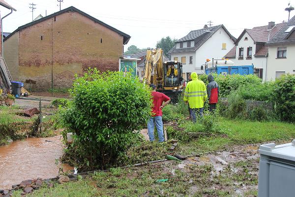 Während die Helfer aus Dirmingen zu den ersten Einsatzstellen ausrückten, mussten sich die Einsatzkräfte aus den übrigen Löschbezirken erst den Weg nach Dirmingen freikämpfen: Auf der L112 versperrte in Höhe des Friedhofs Geröll den Weg. Gemeinsam mit dem Gemeindebauhof musste hier zuerst einmal schweres Gerät eingesetzt werden, um freie Bahn für die Einsatzfahrzeuge zu schaffen.