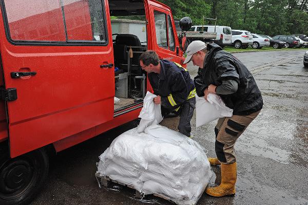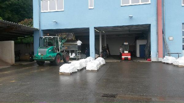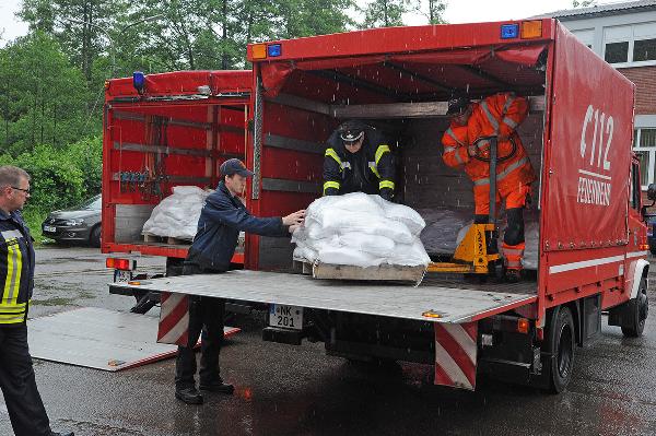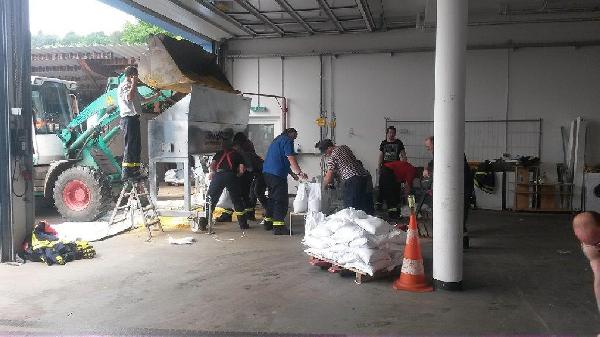 Ein Großteil der Säcke kamen von der Feuerwehr Schmelz, wo die Sandsackfüllanlage des Landkreises Saarlouis stationiert ist. Rund 30 Helfer aus Schmelz, Primsweiler, Michelbach und Dorf waren dort ab 09:45 Uhr damit beschäftigt, 30 Kubikmeter Sand in Sandsäcke zu füllen und mit den Gerätewägen Logistik aus Schmelz, Illingen und Uchtelfangen nach Dirmingen zu bringen. Bis um 16:00 Uhr waren die Helfer in Schmelz im Einsatz.
