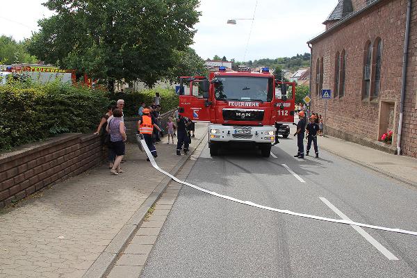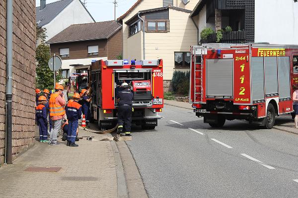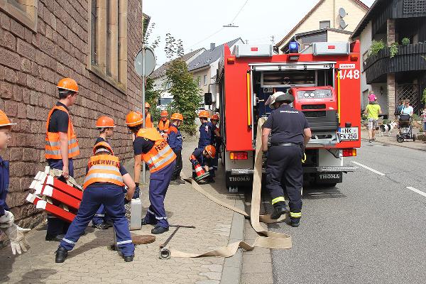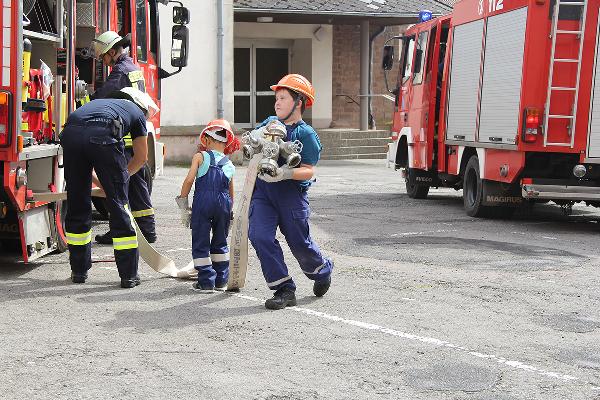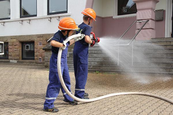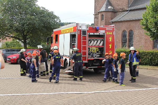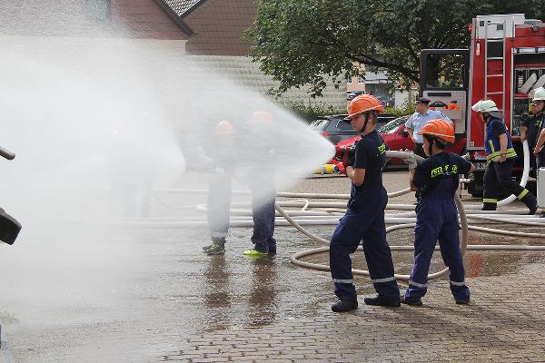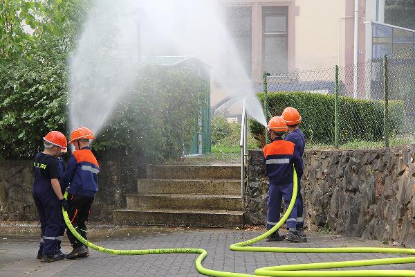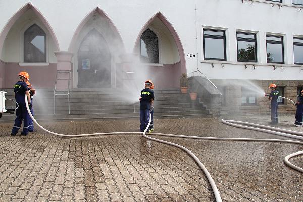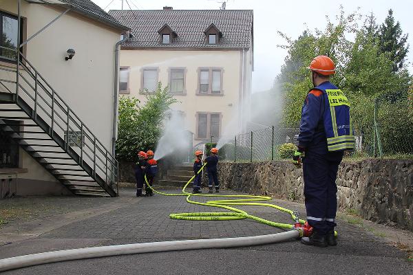 Veranstaltungsort für die gemeinsame Übung war in diesem Jahr der Ortsteil Humes. Im Bereich der Pfarrkirche wurde ein Brand angenommen, der von den Jugendlichen gelöscht werden musste. Schnell wurden die Schläuche ausgerollt und die Wasserversorgung aus Hydranten aufgebaut. Es dauerte nicht lange, bis "Wasser marsch" gegeben wurde und das Wasser aus den Rohren spritzte.