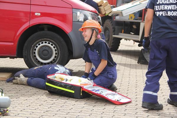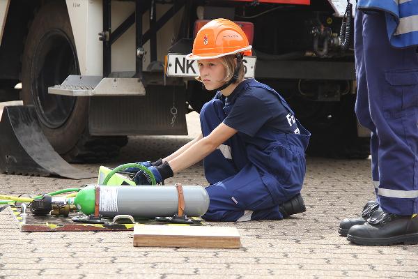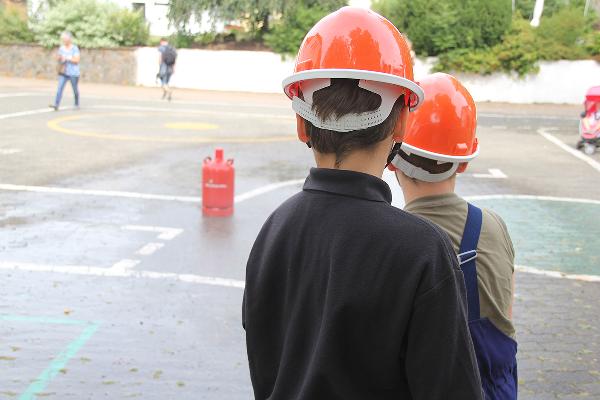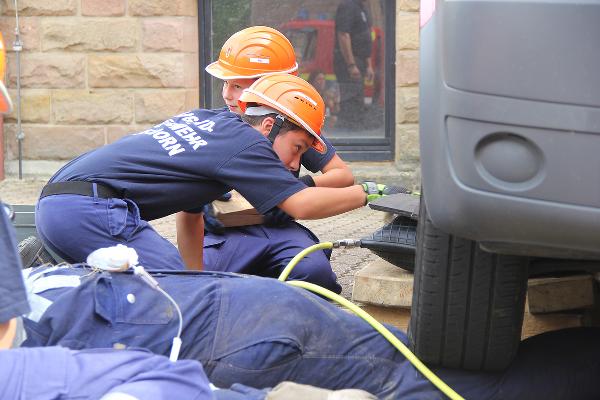 Auf dem Schulhof der Montessorischule hatten die Jugendlichen ebenfalls einen Brand zu bekämpfen. Ausserdem mussten dort zwei Propangasflaschen gekühlt werden. Und vor dem Schulgebäude galt es, eine Person unter einem Fahrzeug zu befreien. Bei dieser technischen Hilfeleistung musste das Fahrzeug mit Hölzern unterbaut und dann mit pneumatischen Hebekissen angehoben werden.