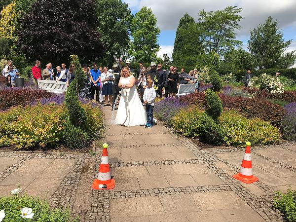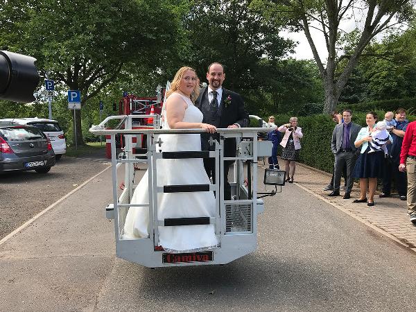 Mit einem Tunnel aus Schläuchen wurde das Brautpaar von den Kameraden und Kameradinnen empfangen und die besten Glückwünsche aller Mitglieder in Form eines kleinen Präsents überbracht. Jochen musste mit einem Rettungsknoten zeigen, dass er das Feuerwehrhandwerk beherrscht, Liane konnte ihr Geschick an der Kübelspritze unter Beweis stellen.