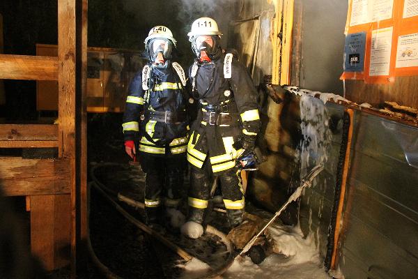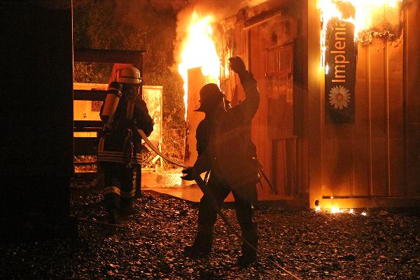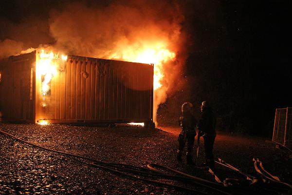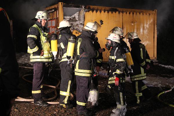 Beim Eintreffen der Einsatzkräfte stand der als Büro genutzte Baucontainer bereits im Vollbrand. Die sofort eingeleitete Brandbekämpfung erfolgte mit zwei Trupps zum Teil unter umluftunabhängigem Atemschutz mit je einem C-Rohr. Da an der Autobahnauffahrt keine Hydranten zur Verfügung standen, musste das benötigte Löschwasser durch Pendelverkehr zur Einsatzstelle gebracht werden.