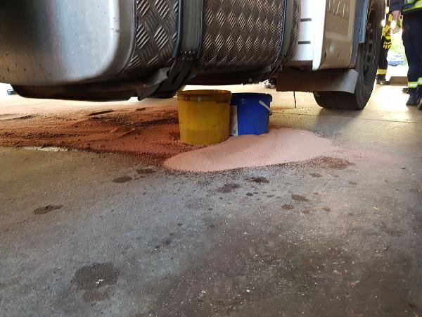 Noch vor dem Eintreffen der Einsatzkräfte aus dem Löschbezirk Bubach-Calmesweiler hatte der Fahrer mit einem untergestellten Eimer dafür gesorgt, dass der austretende Kraftstoff aufgefangen wird. Mit einem Spanngurt und einem Holzklotz sowie einem Stück Feuerwehrschlauch konnte die kleine Schadstelle notdürftig verschlossen werden. Dann konnte der Kraftstoff in dem Tank mit einer speziellen Dieselpumpe in bereitgestellte Fässer umgepumpt werden. Ein weiteres Austreten von Kraftstoff konnte durch diese Maßnahmen verhindert werden. Die Verkehrsfläche unter dem beschädigten Tank wurde mit Bindemitteln abgestreut.