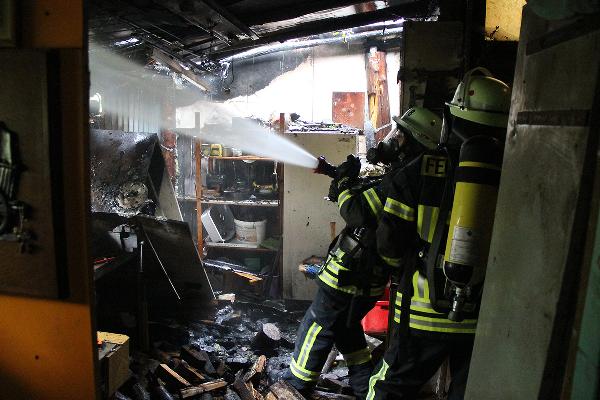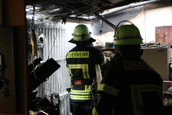 Beim Eintreffen der Einsatzkräfte schlugen die Flammen schon durch die Dachhaut des Gebäudes. Unter Atemschutz und mit dem Einsatz von zwei Rohren gelang es aber schnell, das Feuer unter Kontrolle zu bringen und eine weitere Brandausbreitung zu verhindern.