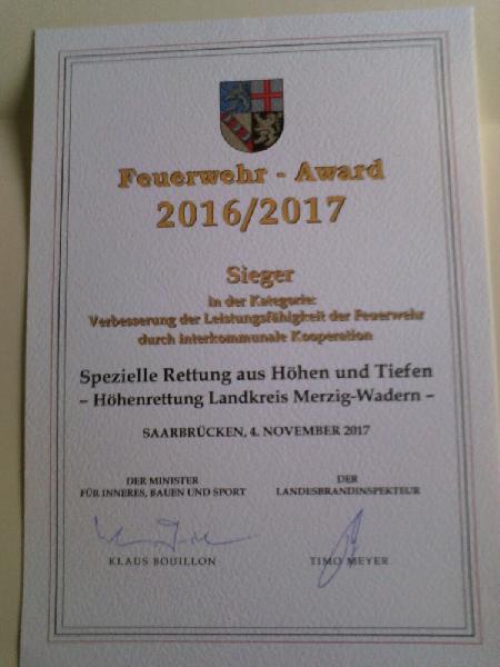 Im Jahr 2017 ist Peter Leist zusammen mit der Höhenrettungseinheit des Landkreises Merzig – Wadern bereits zu 7 Einsätzen alarmiert worden. Diese „Interkommunale Zusammenarbeit“ von den Feuerwehren mehrerer Gemeinden über die Grenzen der Landkreise, funktioniert einwandfrei und hat eine solche Auszeichnung mehr als verdient.