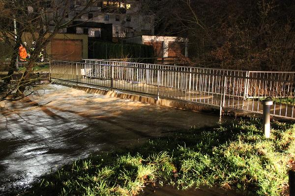 Und auch in Dirmingen musste die Feuerwehr ausrücken, nachdem der Alsbach in Höhe der Böllinger Straße über die Ufer zu treten drohte. Eine Fußgängerbrücke war dort bereits überspült und das Wasser drohte, in den Keller eines Gebäudes zu laufen. Mit Sandsäcken konnten hier wie auch an den anderen Einsatzstellen Schäden verhindert werden.