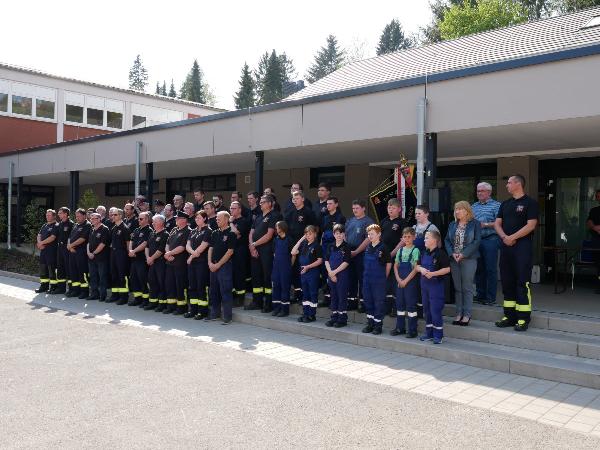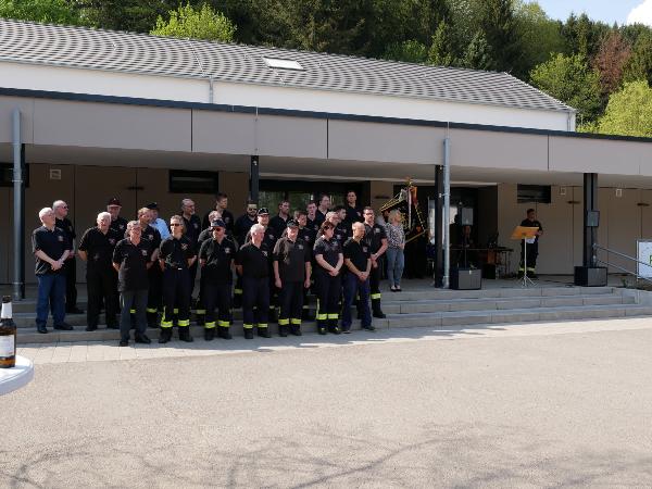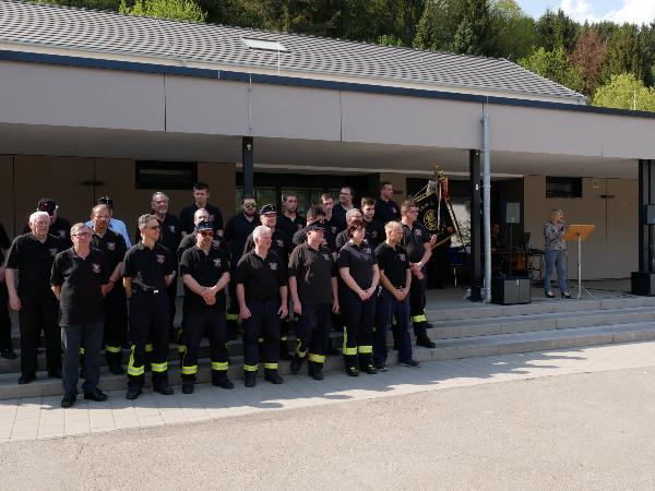 Alle warteten darauf, dass aus der Fahrzeughalle das neue HLF20 herausgefahren würde. Es war wohl für alle anwesenden Gäste und Bürger eine Überraschung, als aus der vernebelten Halle das alte Fahrzeug LF16 heraus kam. Dann hörte man aus der Ferne ein Sondersignal, dass immer näher kam. Auf den Hof fuhr das neue HLF20, besetzt mit den Kameraden/innen der Jugendfeuerwehr Dirmingen.