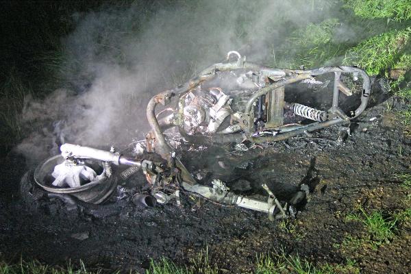 Im Bereich Bahnhof Dirmingen verlor sich die Spur des Flüchtigen. Doch noch keine Stunde später entdeckte ein Passant im Bereich Brühlpark einen brennenden Motorroller und wählte den Notruf.