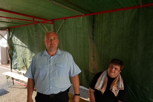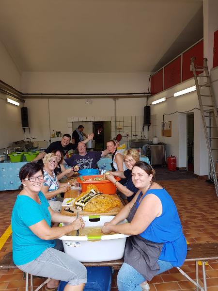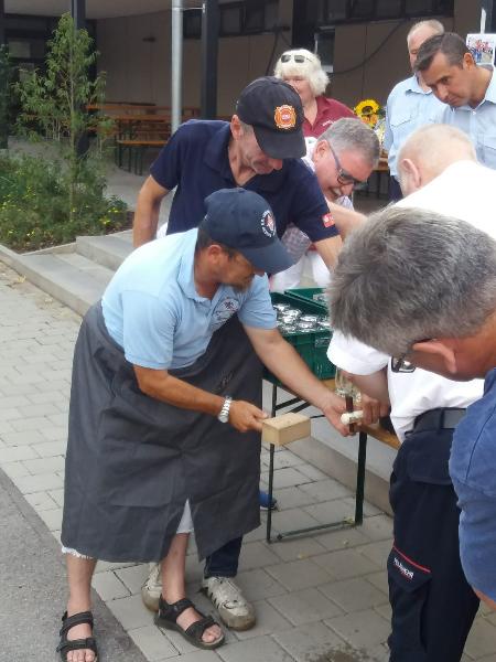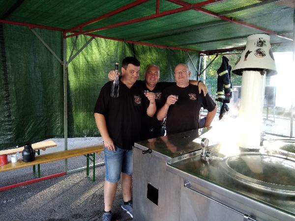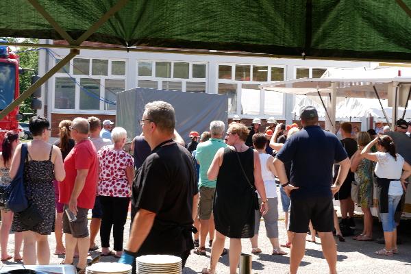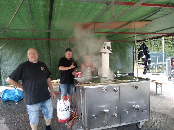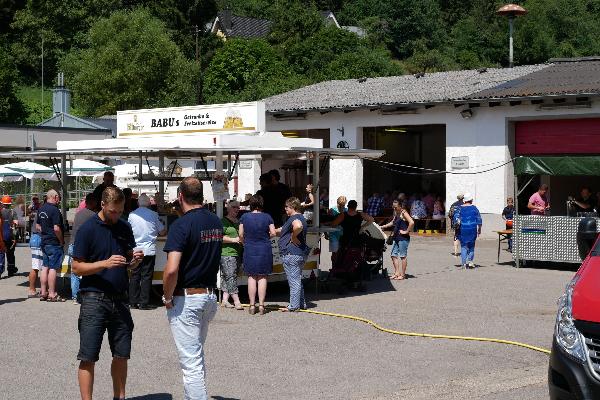 Die Nachtwache wurde dann am Sonntagmorgen um 05:30 Uhr vom Feldküchen-Team und vom Spießbraten-Team abgelöst. Beide Teams beginnen Ihre Arbeit morgens in der Frühe, da gutes Essen bekanntlich auch eine gute Zeit braucht. Um 10 Uhr wurde der Bierstand geöffnet. Die erste Schicht übernehmen seit Jahren die Kameraden der Reservisten-Kameradschaft Illtal, die uns über die Mittagszeit stark entlasten. Hier muss man auch an dieser Stelle Dank sagen. Viele Besucher kamen zum Mittagessen bei die Feuerwehr. Mit Spießbraten, Pommes und Salat, sowie der traditionellen Erbsensuppe, traf man genau den Geschmack der örtlichen Saarländer. Es gab viel Lob an die Küche, was natürlich schon etwas stolz macht.