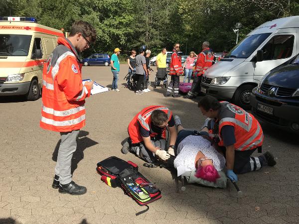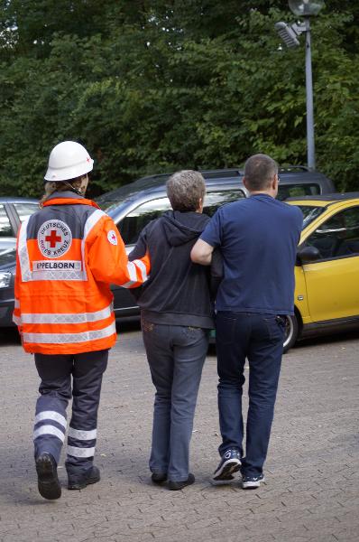 Vor dem Gebäude warteten bereits Helfer des DRK auf die Geretteten und übernahmen die weitere Versorgung. Während der Rettung stellten andere Einatzkräfte die Löschwasserversorgung aus Hydranten her und begannen mit dem Löschangriff auf den vermeintlichen Brand. Haustechniker, der brandschutztechnische Beauftragte des saarländischen Schwesternverbandes und die Heimleitung, die ebenfalls intensiv bei der Vorbereitung der Übung geholfen hatte, beobachteten interessiert die Übung.