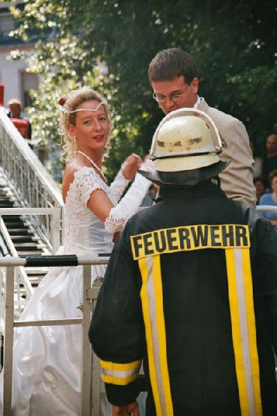 Als sie nach der Zeremonie die Kirche verließen, mussten beide erstmal ihre Ehetauglichkeit unter Beweis stellen, in dem sie das Band der Ehe ganz in Feuerwehrmanier mit Knoten und Stichen knüpften.
