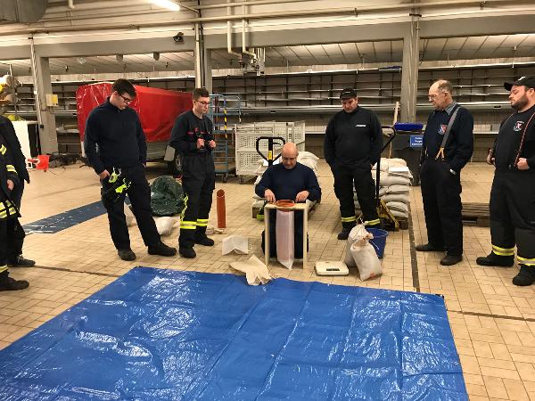 Beim praktischen Teil in der Fahrzeughalle wurde geprobt, wie man Sandsäcke in einer Kette schnell weiterreichen kann. Auch wurden Hilfsmittel vorgestellt, mit denen die Säcke schnell gefüllt werden können.