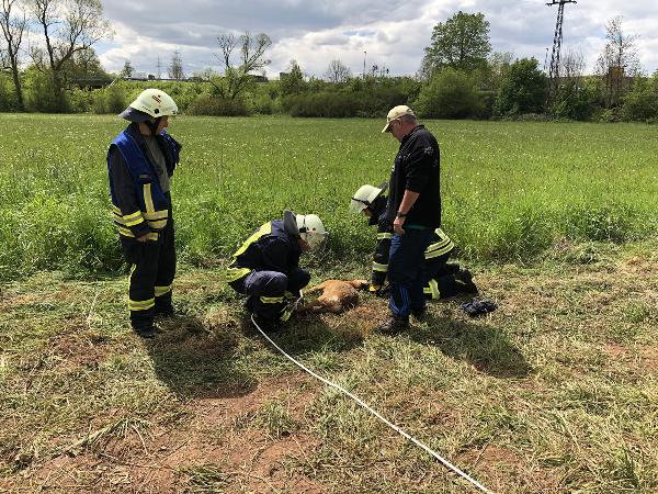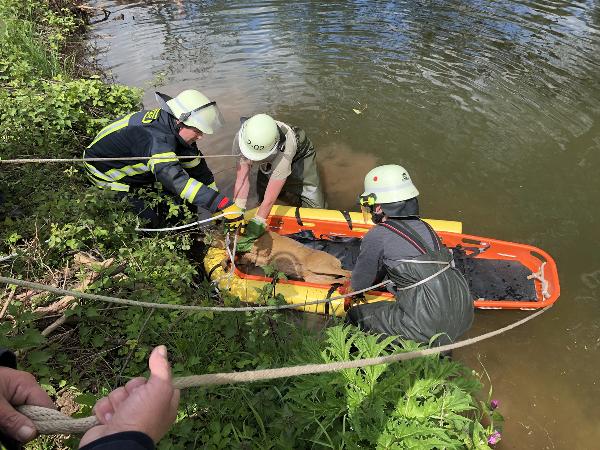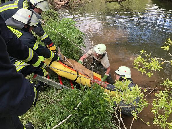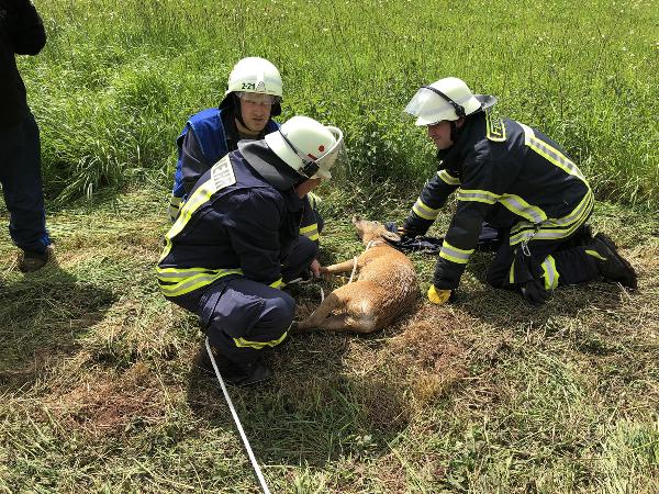 Der ebenfalls anwesende Jagdausübungsberechtigte untersuchte das Tier und stellte fest, dass es auf beiden Augen erblindet und wahrscheinlich deshalb in die missliche Lage geraten war. Mit einem Fangschuss musste er das Tier erlösen.