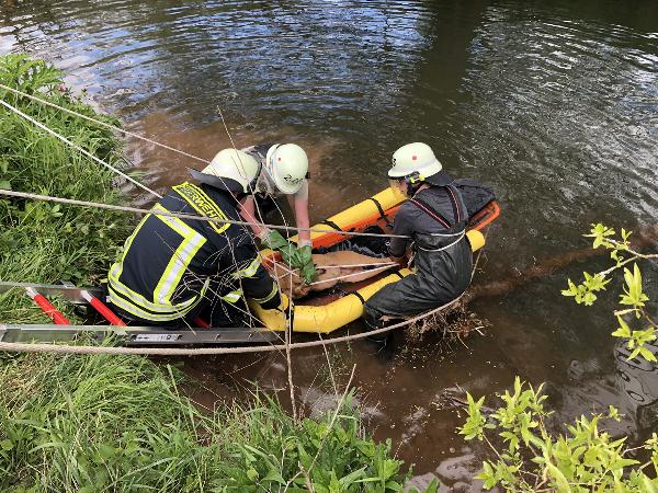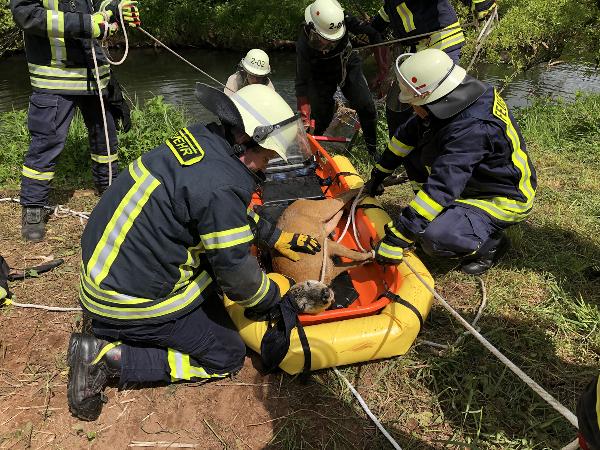 Der Bock wurde zuerst mit einer Leine gesichert und dann auf einer Schleifkorbtrage, die als Schwimmhilfe mit einem Auftriebkörper versehen war, gelegt und fixiert. So konnte er schließlich an Land gebracht werden.
