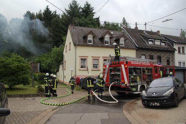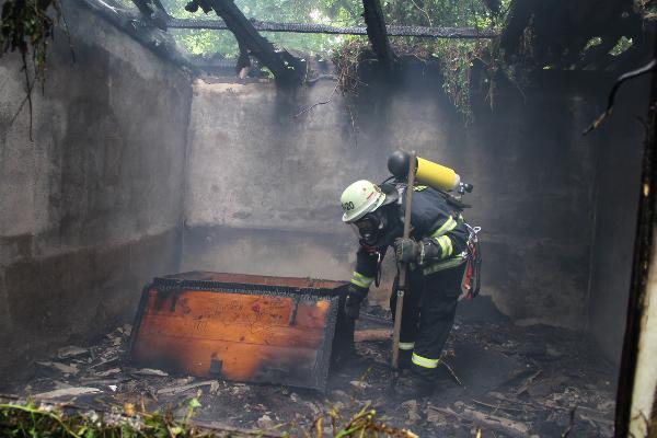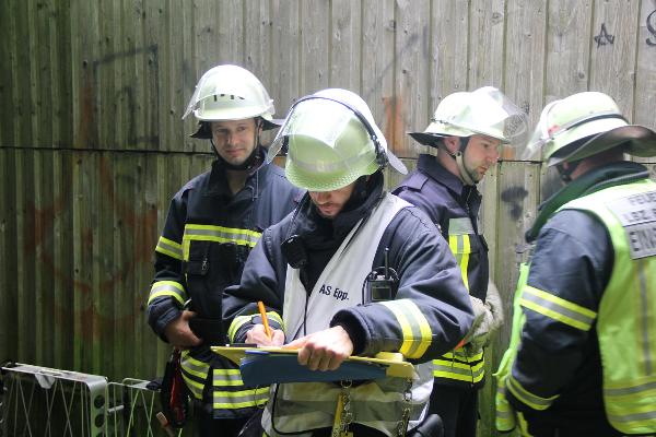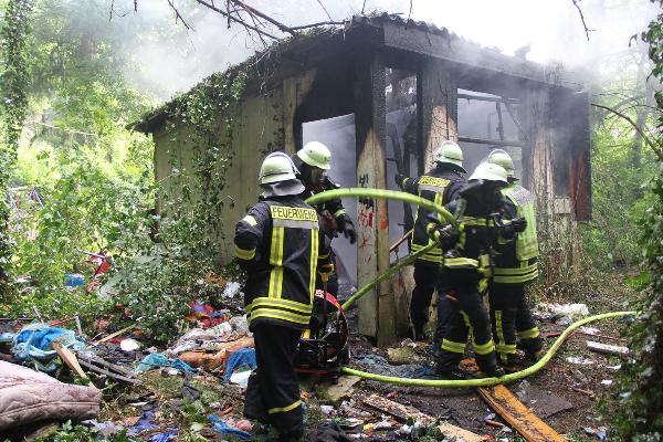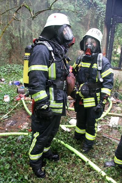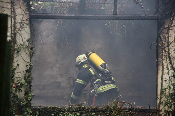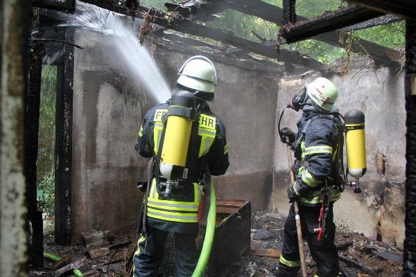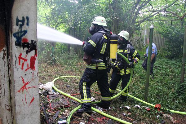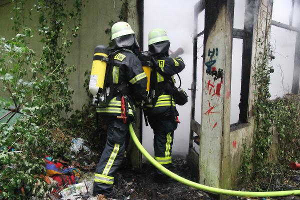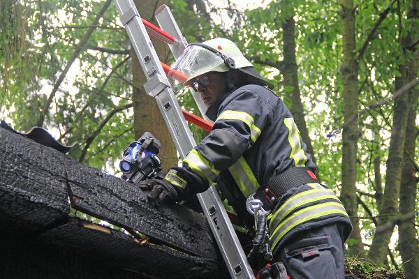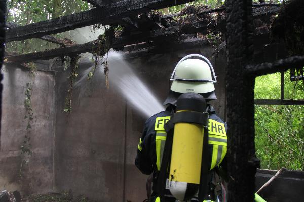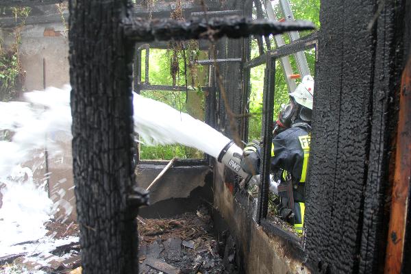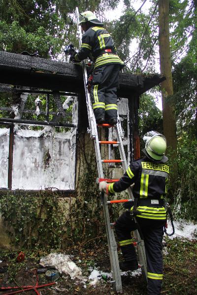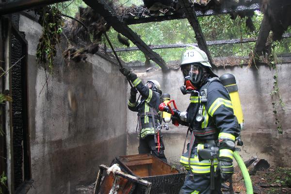 Unter Atemschutz konnte ein Trupp den Brand mit einem C-Rohr schnell löschen. Teile der Konstruktion mussten mit Einreißhaken niedergerissen werden, da immer wieder Flammen aus der Dachkonstruktion aufloderten. Um sicherzugehen, dass sich zum Brandzeitpunkt keine Personen in dem Gebäude aufgehalten hatten, wurde der dichte Brandrauch mit einem Drucklüfter weggeblasen.