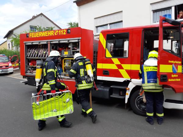 Die zuerst eintreffende Einheit aus dem Löschbezirk Wiesbach rüstete sich sofort mit Atemschutz aus und begab sich in die stark verrauchte Firmenhalle um nach dem vermissten Kind zu suchen.