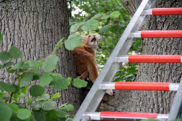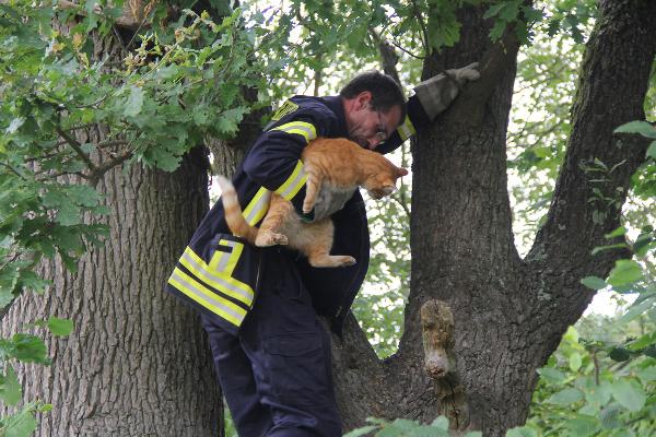 Mit einer Steckleiter wurde zuerst versucht, dem Fellnase eine Möglichkeit zu bieten, aus eigener Kraft wieder auf sicheren Boden zu kommen. Doch die Katze war zu verängstigt und traute sich nicht herunter. Schließlich stieg ein Feuerwehrmann zu dem Tier in den Baum und schnappte es mit einem beherzten Griff.