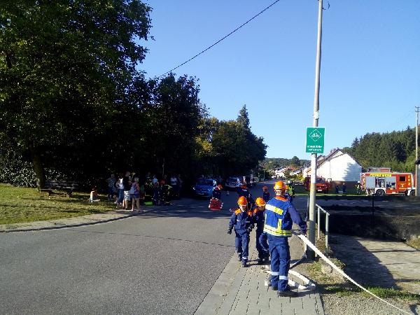Diese Übung, welche durch zwei Klassenkameraden in jeweils einem der beteiligten Löschbezirke vor einigen Jahren ins Leben gerufen wurde, hat sich mittlerweile im Übungsplan etabliert. Angenommen wurde an diesem Abend, dass es auf dem Gelände des Betriebes zu einem Brand einer Stallung gekommen war. Mehrere Personen wurden vermisst. Gleichzeitig lief aus einem Behälter eine gefährliche Flüssigkeit aus und drohte in das Kanalsystem einzudringen.
