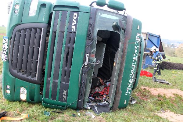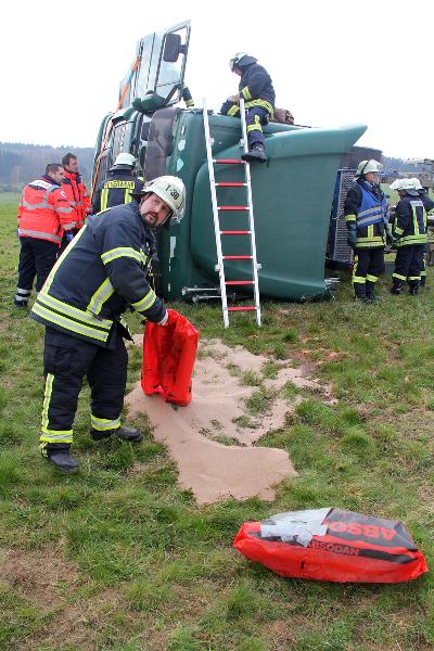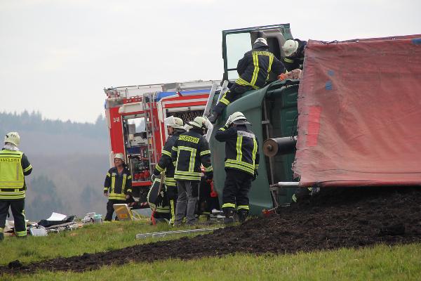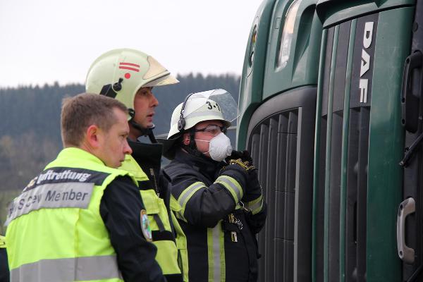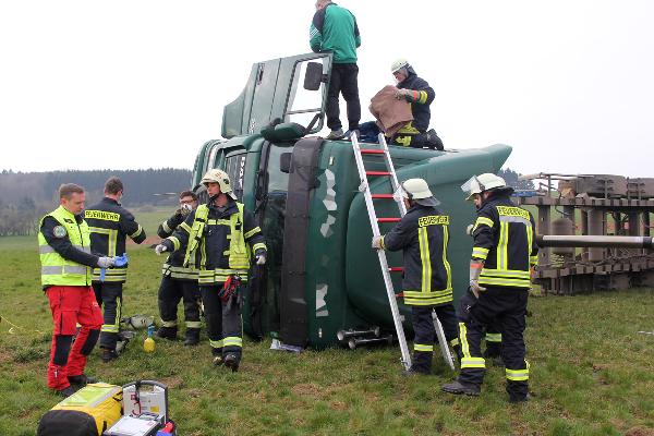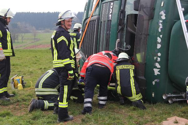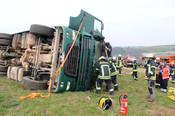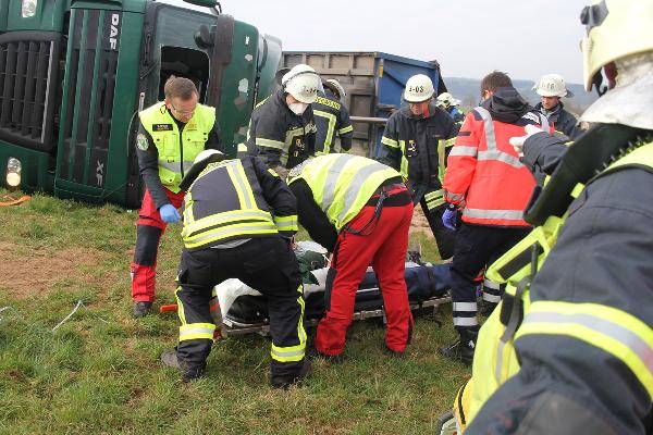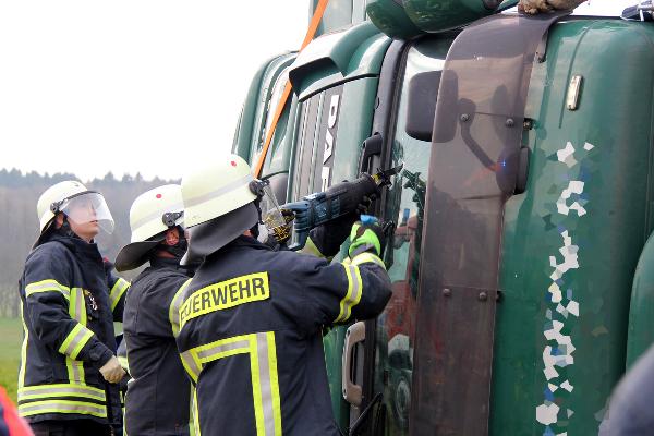 Die Einsatzkräfte der Feuerwehr sorgten mit Leitern für einen Zugang zum Patienten. Zur Befreiung musste dann die Frontscheibe herausgetrennt werden. Auslaufender Kraftstoff aus den rund 600 Liter fassenden Tanks des Fahrzeugs musste mit Wannen aufgefangen und die Reste anschließend aus den beschädigten Tanks abgepumpt werden.