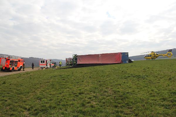 Der verletzte Fahrer wurde vom Notarzt vor Ort erstversorgt und dann mit dem Hubschrauber zur weiteren Behandlung in ein Krankenhaus geflogen. Da bei dem Unfall rund 350 Liter Dieselkraftstoff ausliefen, war auch das Landesamt für Umwelt- und Arbeitsschutz (LUA) vor Ort. Die weitere Bergung des Fahrzeugs wurde durch das Unternehmen des Unfallfahrzeugs übernommen.
