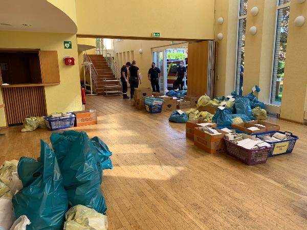 Am heutigen Sonntag findet jetzt die Verteilung an die einzelnen Haushalte statt. Dabei unterstützt auch die Feuerwehr mit Helfern sowie mehreren Mannschaftstransportfahrzeugen beim Transport der Masken in die Ortsteile und zusammen mit vielen weiteren Helfern an die Haushalte.