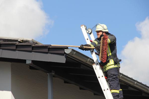 Beim Eintreffen der Einsatzkräfte flatterte das verängstigte Tier kraftlos mit den Flügeln und saß offensichtlich im Abwehrgitter fest, das eigentlich verhindern sollte, dass Vögel unter die Solarpanele krabbeln. Mit einer Leiter kletterte ein Feuerwehrmann nach oben und konnte mit einem Besenstiel die Drahtgitter soweit auseinander biegen, dass das Tier befreit werden konnte.