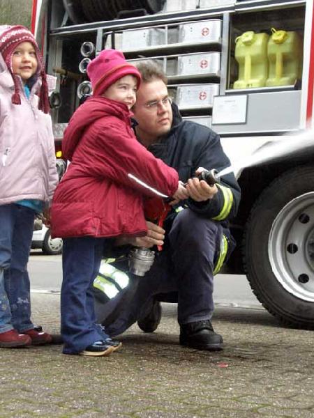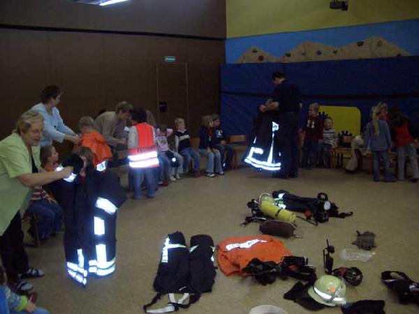 Gestartet wurde mit einem Besuch der Feuerwehr im Kindergarten, bei denen den Kindern die verschiedenen Aufgaben und Ausstattungen der Feuerwehr näher gebracht wurden. Mit Begeisterung und glänzenden Augen waren die Kinder engagiert bei der Sache, als sie mit vielen mitgebrachten Gerätschaften einen Feuerwehrmann komplett ausrüsten sollten. Unter Anleitung von Felix Becker, Eric Holzer und Frank Recktenwald lernten sie damit spielerisch die Bedeutung und Funktion der Schutzausrüstungsgegenstände kennen.