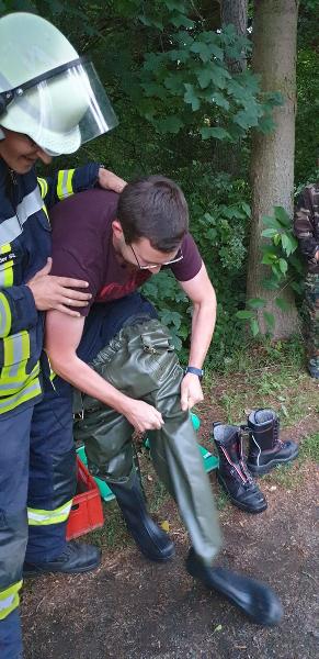 Die alarmierte Feuerwehr konnte das kleine Küken in einer Tiefe von etwas über einem Meter entdecken. Ausgerüstet mit Wathosen entfernten daraufhin zwei Kameraden das Schutzgitter und konnten das Küken mit einer Schaufel aus dem Schacht retten. Es wurde zurück in das Nest gelegt.