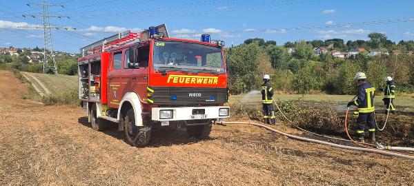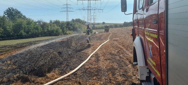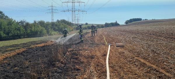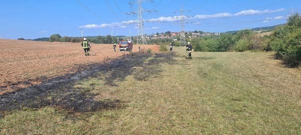Auf der Anfahrt konnten die alarmierten Kräfte die Rauchentwicklung bestätigen. Neben einem abgeernteten Feld waren bereits rund 20 Quadratmeter einer Wiese in Brand geraten.