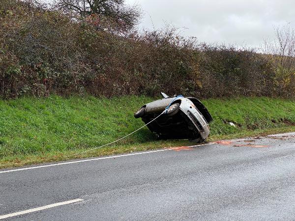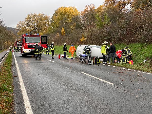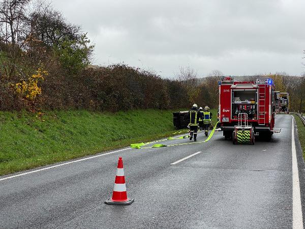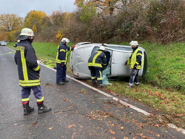 Die Fahrerin erlitt bei dem Unfall augenscheinlich nur leichte Verletzungen, wurde aber nach einer ersten Untersuchung durch einen Notarzt zur weiteren Behandlung in ein Krankenhaus gebracht. Die Fahrbahn wurde mit einer Kehrmaschine des Gemeindebauhofes, die zufällig an der Einsatzstelle vorbeikam, gereinigt und die Einsatzstelle an die Polizei übergeben. Die Landstraße musste während der Rettungs- und Bergungsarbeiten voll gesperrt werden. Die Unfallursache ist nicht bekannt.