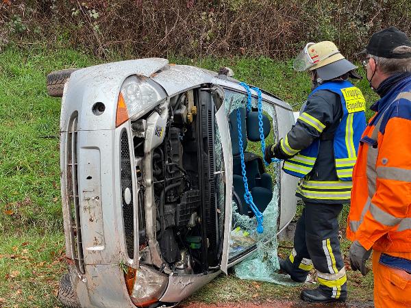 Die Meldung, eine Person sei in dem Fahrzeug eingeklemmt, bestätigte sich zum Glück nicht: Ersthelfer konnten die Frontscheibe des Fahrzeugs einschlagen und die junge Frau noch vor Eintreffen der Feuerwehr befreien. Rettungssanitäter der Feuerwehr übernahmen die Erstversorgung bis zum Eintreffen des Rettungsdienstes. Die Einsatzkräfte stellten den Brandschutz sicher und klemmten die Fahrzeugbatterie ab. Auslaufende Betriebsstoffe wurden mit Bindemitteln aufgenommen.