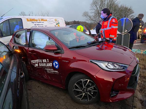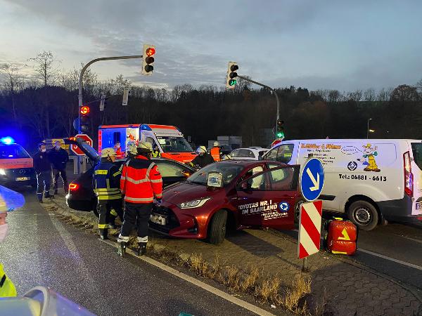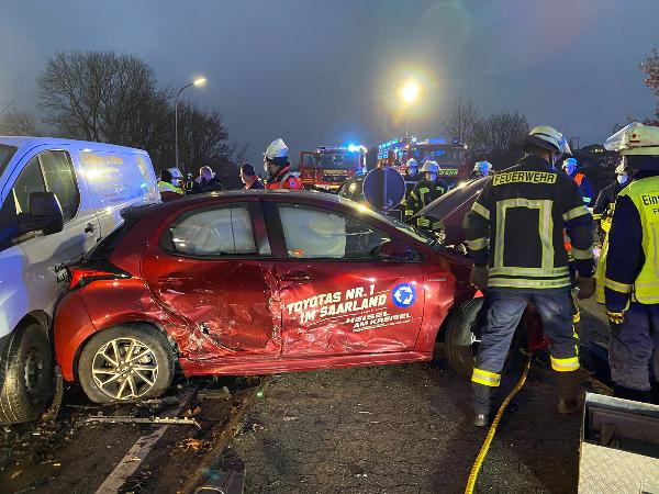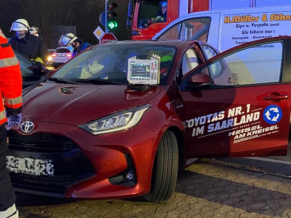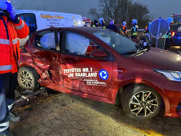 Während sich beide Fahrer aus eigener Kraft und augenscheinlich unverletzt aus den Fahrzeugen befreien konnten, wurde die Beifahrerin des Toyota im Fahrzeug eingeklemmt. Zur technischen Rettung wurden daher neben Polizei und Rettungsdienst auch die Löschbezirke Bubach-Calmesweiler, Eppelborn und Macherbach alarmiert.