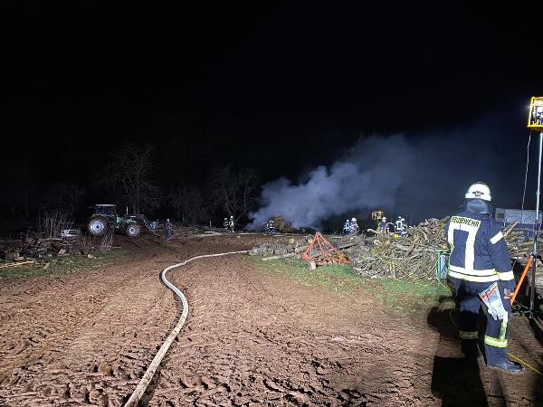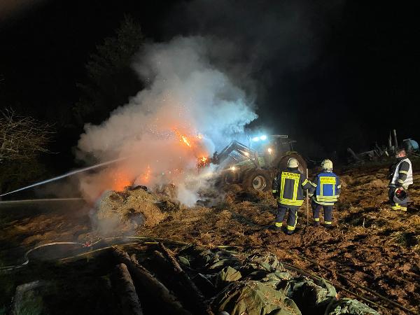 Vor Ort bestätigte sich die Meldung, dass ein Strohlager von etwa 120 Strohballen im Vollbrand stand. Auch ein in unmittelbarer Nähe abgestelltes Güllefass hatte bereits Feuer gefangen. Der Hofbesitzer schritt sofort zur Tat und zog das Fass mit seinem Schlepper vom Brandherd weg um den Schaden am Fass möglichst gering zu halten.