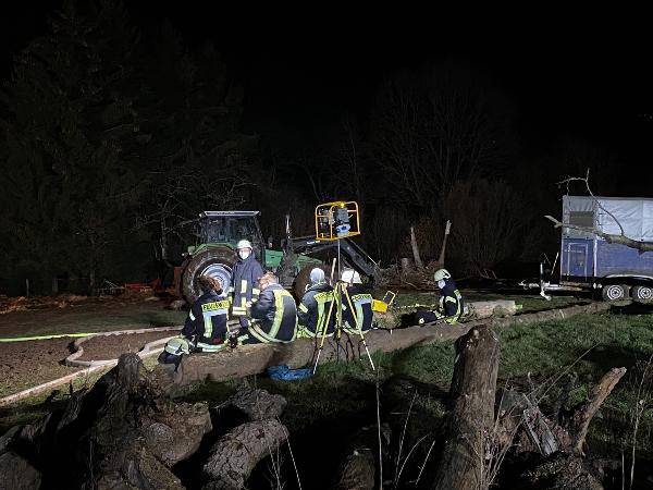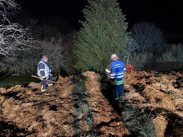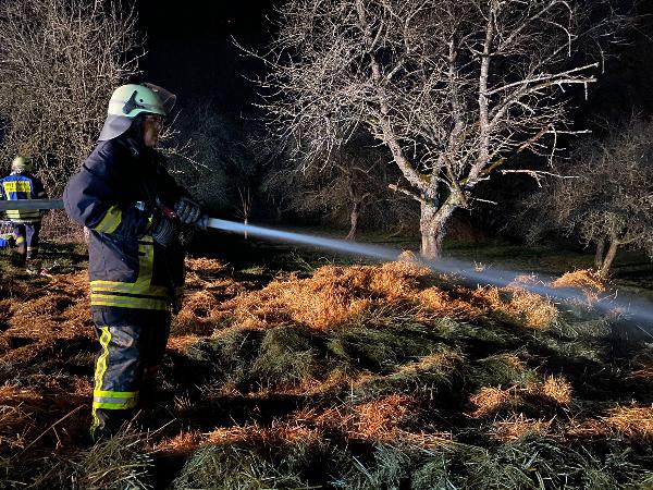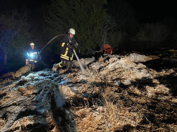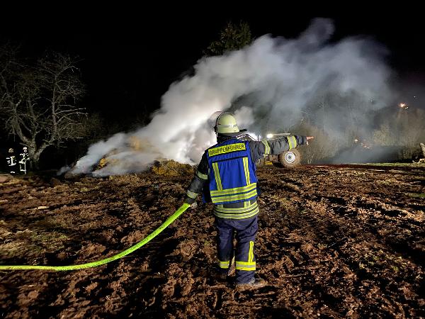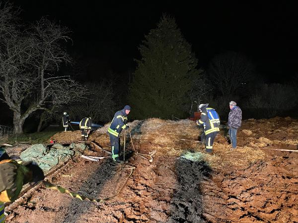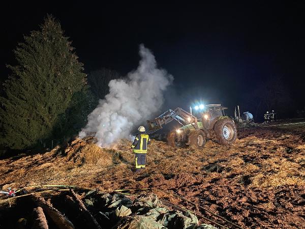 Um eine effektive Brandbekämpfung vornehmen zu können musste das gepresste Stroh großzügig auseinander gezogen werden. Hierbei unterstützte der Hofbesitzer mit seinem Traktor, was sich jedoch als schwierig gestaltete, da sich durch den Regen der vergangenen Tage und Wochen die Wiesenfläche in eine sumpfige, lehmige Fläche verwandelte. Der Traktor hatte enorme Schwierigkeiten am abschüssigen Gelände Grip zu bekommen.