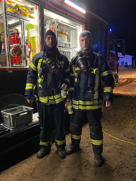 Unverzüglich wurde durch die ersten Einheiten ein Löschangriff aufgebaut um die Flammen niederzuschlagen. Auch ein Trupp unter Atemschutz löschte parallel das Güllefass ab, welches im Bereich der Reifen brannte.