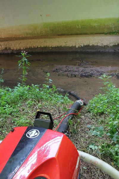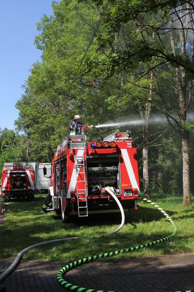 Die Wasserversorgung wurde durch eine Tragkraftspritze aus der Ill sichergestellt, hier musste die Saugstelle hergerichtet werden. Bei der Verlegung der Schlauchleitungen war die Jugendwehr auch an dieser Stelle eine tatkräftige Hilfe.