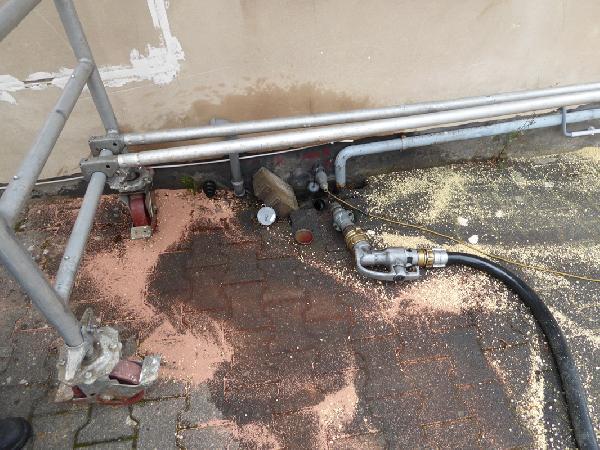 Während des Tankvorgangs kam es zu einem Defekt am Füllstutzen des Hauses, sodass das Heizöl nicht mehr in die Zuleitung der Heizöltanks lief sondern sich in der Einfahrt seinen Weg suchte.
