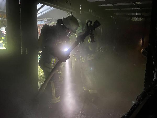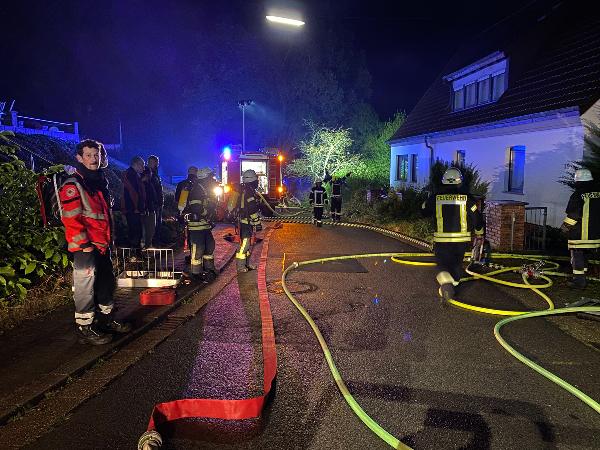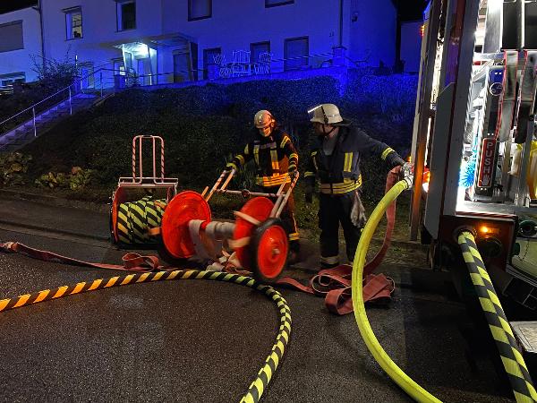 Da der sich vor dem Anwesen befindliche Hydrant nicht genug Löschwasser bereitstellen konnte, wurde eine Versorgungsleitung zu einem anderen Hydranten in rund 400 Metern Entfernung aufgebaut. Während die Flammen schnell gelöscht werden konnten, dauerten die Nachlöscharbeiten noch bis gegen 23 Uhr an. Mit Wärmebildkameras wurde immer wieder nach versteckten Glutnestern gesucht, die dann abgelöscht wurden.