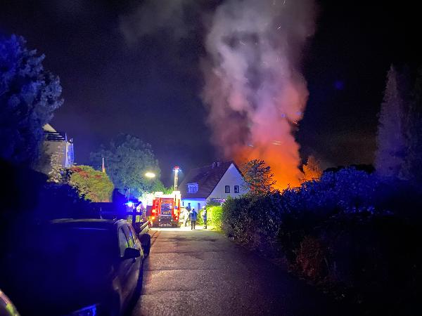 Ein Übergreifen der Flammen auf das Wohnhaus konnte durch den schnellen Einsatz verhindert werden. Trotzdem sind durch die Hitzeeinwirkung einige Scheiben an einem Anbau beschädigt worden. Die Einsatzstelle wurde an die Polizei übergeben, die die Ermittlungen zur Brandursache aufgenommen hat.
