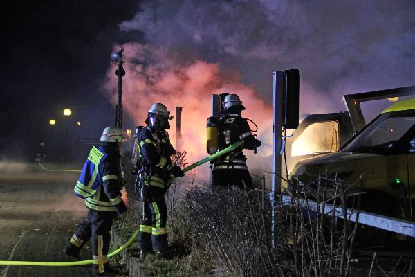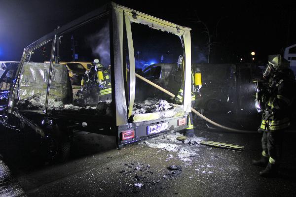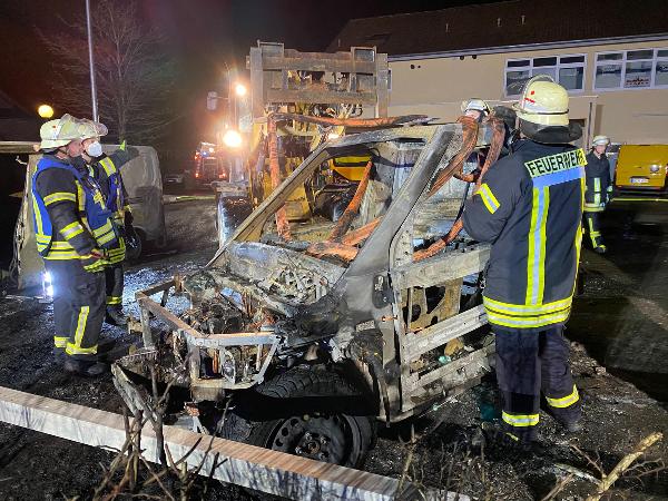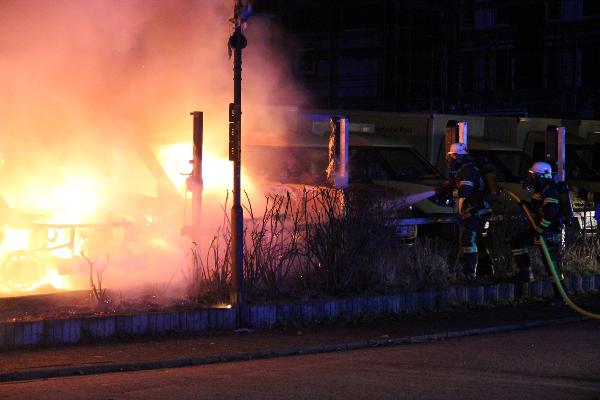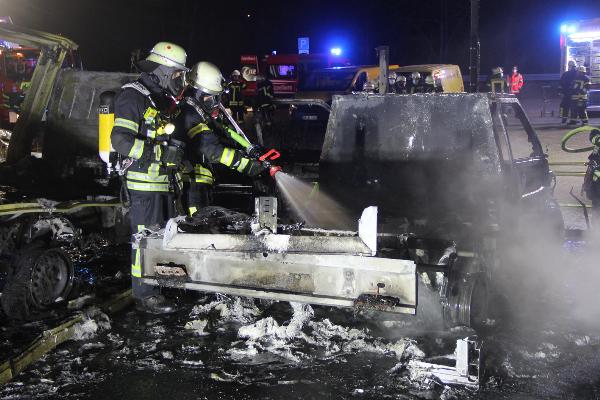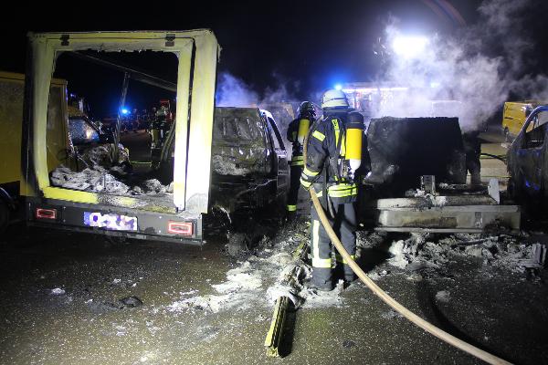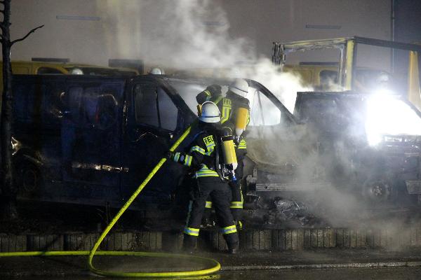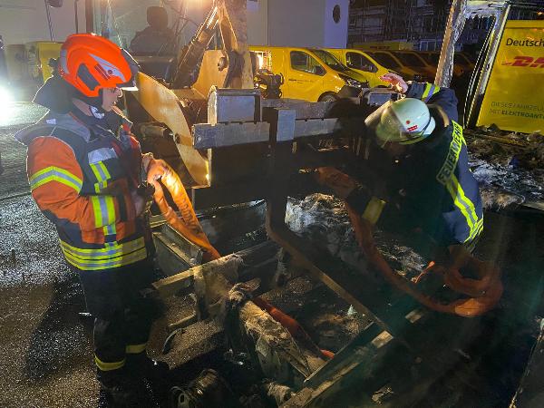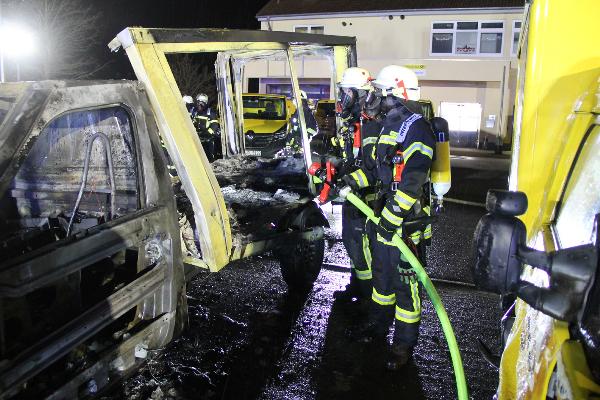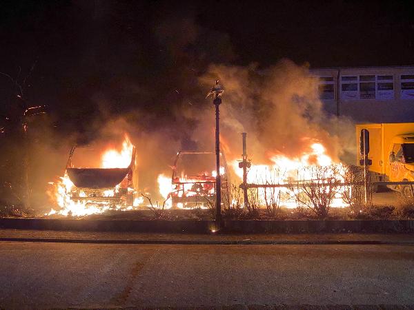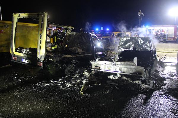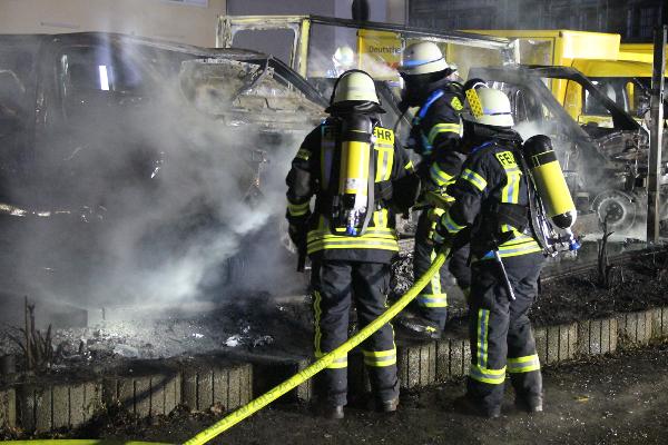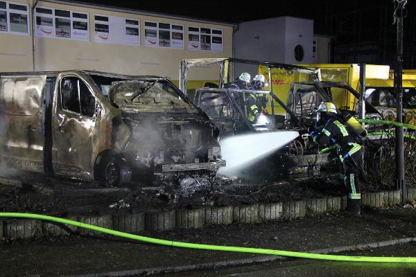 Drei Fahrzeuge brannten vollständig aus, ein weiteres wurden durch die Hitze erheblich beschädigt. Postsendungen befanden sich nicht in den Fahrzeugen. Die Polizei hat die Ermittlungen zur Entstehungsursache aufgenommen. Der Einsatz der Feuerwehr dauert bis kurz nach 6:00 Uhr am Morgen, das Wiederherstellen der Einsatzbereisschaft dauert bis gegen 08:00 Uhr.