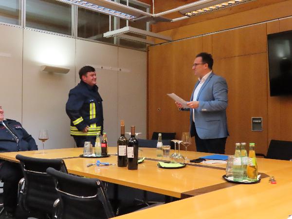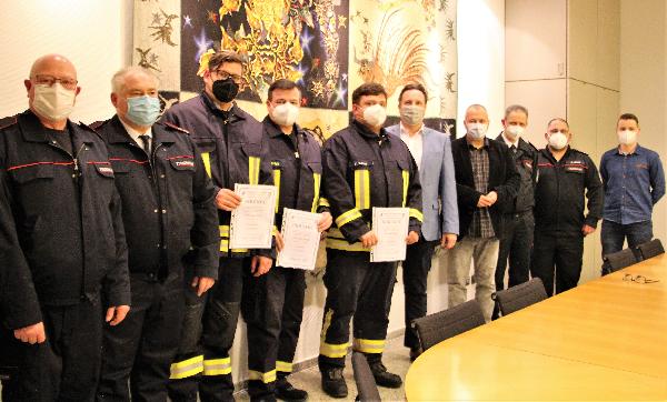 Bürgermeister Dr. Andreas Feld gratulierte und überreichte die Urkunden. Die Gratulation und Glückwünsche der anwesenden Führungskräfte aus Politik und Feuerwehr erfolgte ebenfalls umgehend. Normalerweise werden solche Beförderungen an der Jahreshauptversammlung oder an Familienabendenden durchgeführt. Aus Pandemie Gründen finden diese aber zur Zeit nicht statt. Dennoch muss der Dienstbetrieb in der Feuerwehr weiter gehen uns so entschied man sich für die Durchführung der Beförderungen im Rathaus.