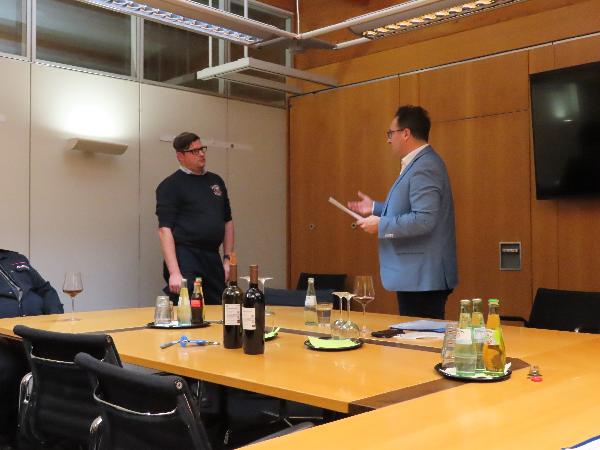 Pünktlich um 18:00 Uhr eröffnete Bürgermeister Andreas Feld die Sitzung. In seiner Laudatio würdigte der Bürgermeister das hohe Engagement von Christian Feit, Alexander Brück und Fabian Schorr im Löschbezirk Dirmingen. Alle drei Kameraden haben in letzter Zeit die Gruppenführerausbildung an der Landesfeuerwehrschule des Saarlandes mit Erfolg abgeschlossen und machen eine sehr gute Arbeit in der Feuerwehr Eppelborn.