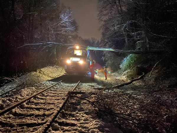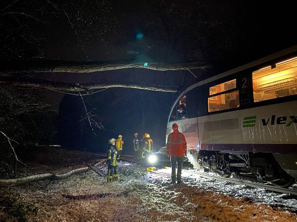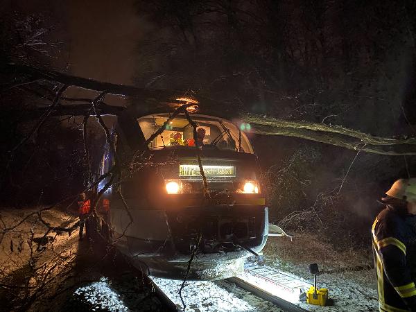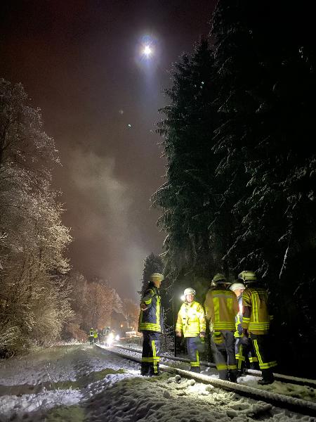 Gegen Mitternacht kam es dann noch zu einem Bahnunfall: Zwischen Wustweiler und Dirmingen war ein Baum auf eine Regionalbahn gestürzt, so dass der Zug nicht weiterfahren konnte. Die 16 Fahrgäste und der Lockführer blieben bei dem Unfall glücklicherweise unverletzt, musste aber die rund 800 Meter bis zum Bahnhof Dirmingen zu Fuß über das Gleisbett zurücklegen. Die Feuerwehren aus Illingen, Wustweiler und Dirmingen leuchteten die Weg aus und begleiteten die Fahrgäste. Dabei kam auch eine Drohne zum Einsatz, um die Einsatzstelle mit ihren Suchscheinwerfer auszuleuchten.