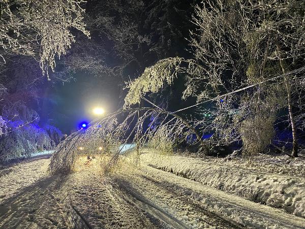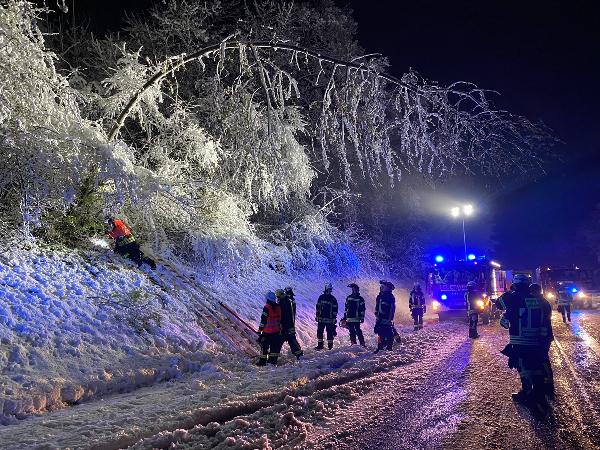 Mit Motorsägen mussten Bäume gefällt, zerteilt und beseitigt werden, um wieder für freie Fahrt zu sorgen. In Habach war ein Baum auf eine Stromleitung gestürzt und hatte so für einen Stromausfall gesorgt. Zusammen mit dem Energieversorger konnte die Stromversorgung aber zügig wiederhergestellt werden.
